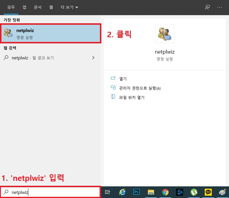 2-1. 좌측하단 검색에 'netplwiz'를 입력 후 실행 합니다.
