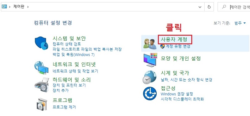 1-2. 제어판에서 '사용자 계정을'을 클릭하시고 사용자 계정에서 또 한번 더 '사용자 계정'을 클릭합니다.
