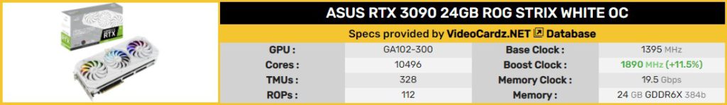 가장 비싼 모델인 RTX 3090 ROG STRIX WHITE OC는 15,290 크로네(덴마크 화폐 통화, Danish Krones)에 등록되어 있으며 대략 2475 달러 입니다.