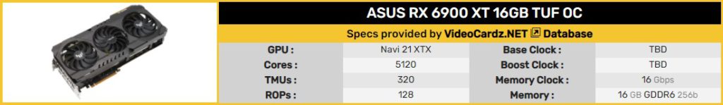 ASUS가 나열한 모델은 TUF Gaming OC로 제조업체가 아직 사양을 공개하지 않았지만 그래픽 카드가 공장에서 오버 클럭되었음을 알 수 있습니다.